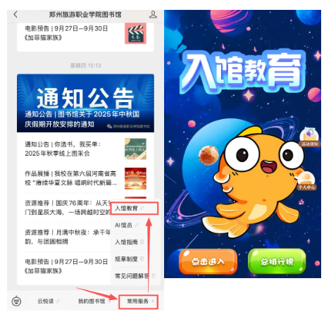 1.关注18体育新利微信公众号(扫描下方二维码),选择“常用服务”,点击“新生入馆教育”。即可跳转至统一身份认证平台登录界面,使用统一身份认证账号密码登录。找到首页“入馆教育”应用,完善个人信息后即可进入活动。